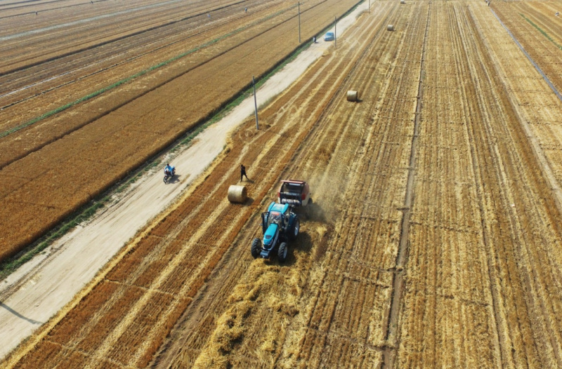 6月14日,在河北省行唐县只里乡北高里村,工人驾驶机械将秸秆打包回收(无人机拍摄)。