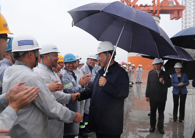 风急云低,雨流如注。13日下午,习近平来到中集来福士海洋工程有限公司烟台基地。作为国内率先进入海洋工程行业的企业,中集来福士用10年左右时间,国产化率从不足10%提高到60%。在厂区码头上,习近平撑着雨伞,趟着积水,近距离察看停靠在这里的自升式修井生活平台,远眺“蓝鲸1号”超深水双钻塔半潜式钻井平台、“泰山”龙门吊、海洋牧场平台,向企业负责人详细了解高端海洋工程设备制造、维护、运行情况。海风吹起了衣襟,雨水打湿了裤腿。习近平站在雨中,同围拢过来的工人们一一握手、亲切交谈,向作业平台上的工人们挥手致意。习近平指出,国有企业特别是中央所属国有企业,一定要加强自主创新能力,研发和掌握更多的国之重器。国有企业要深化改革创新,努力建成现代企业。要坚持党对国有企业的领导不动摇,坚持建强国有企业基层党组织不放松,为做强做优做大国有企业提供坚强组织保证。