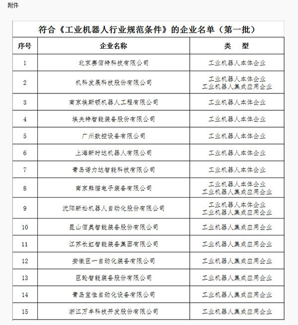 根据《工业机器人行业规范条件》,经各省、自治区、直辖市及计划单列市工业和信息化主管部门和中央企业集团组织申报并审核,工业和信息化部组织专家复核,确定了第一批符合《工业机器人行业规范条件》的企业名单,现予以公告。