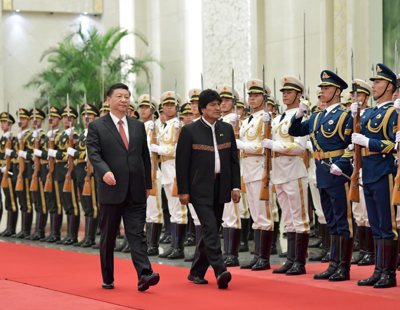 6月19日,国家主席习近平在北京人民大会堂同玻利维亚总统莫拉莱斯举行会谈。这是会谈前,习近平在人民大会堂北大厅为莫拉莱斯举行欢迎仪式。新华社记者 殷博古 摄