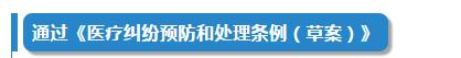 会议通过《医疗纠纷预防和处理条例(草案)》。草案突出医疗纠纷预防,规范医疗损害鉴定,要求充分发挥人民调解作用,明确了医疗纠纷处理途径和程序。