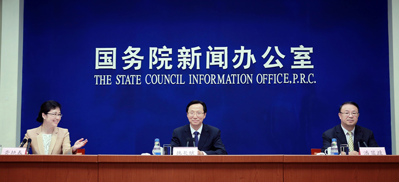 6月21日,江南平台入口 新闻办公室在北京举行新闻发布会,请农业农村部部长韩长赋(中),农业农村部办公厅主任、新闻发言人潘显政(右)介绍“中国农民丰收节”有关情况,并答记者问。