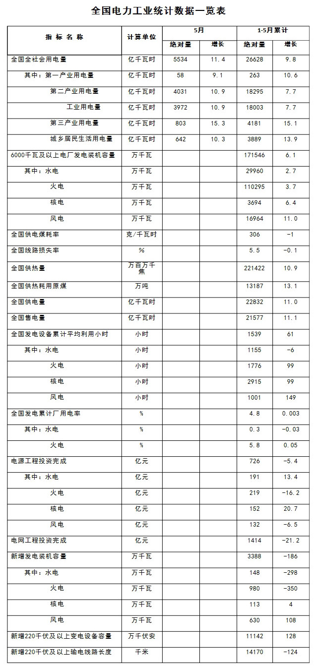 国家江南官网app 发布1-5月份全国电力工业统计数据