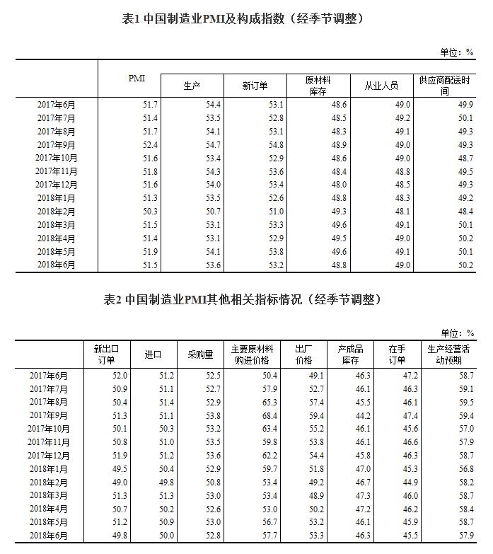 2018年6月份,中国制造业采购经理指数(PMI)为51.5%,比上月回落0.4个百分点,仍高于上半年均值0.2个百分点,制造业总体继续保持扩张态势。