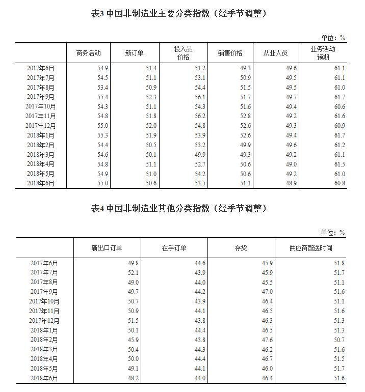 2018年6月份,中国非制造业商务活动指数为55.0%,比上月上升0.1个百分点,高于上半年均值0.2个百分点,非制造业总体保持平稳向好的发展势头。