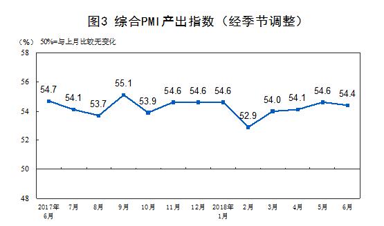 2018年6月份,综合PMI产出指数为54.4%,低于上月0.2个百分点,仍高于上半年均值0.3个百分点,继续位于临界点以上,表明我国企业当期生产经营活动总体延续平稳较快的扩张态势。