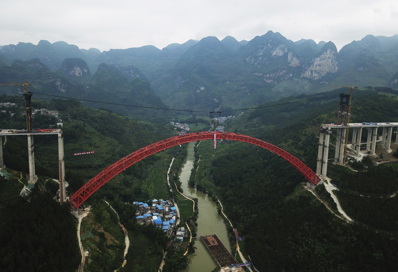 当日,横跨在贵州省罗甸县大井河上的大小井特大桥顺利合龙。这是世界最大跨径上承式钢管混凝土拱桥。该桥主跨450米,全长1.5公里,是平塘至罗甸高速公路关键性工程。
