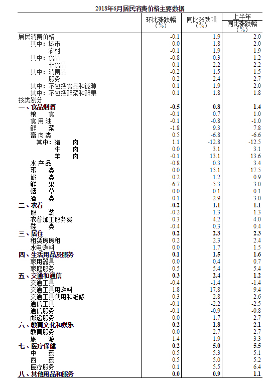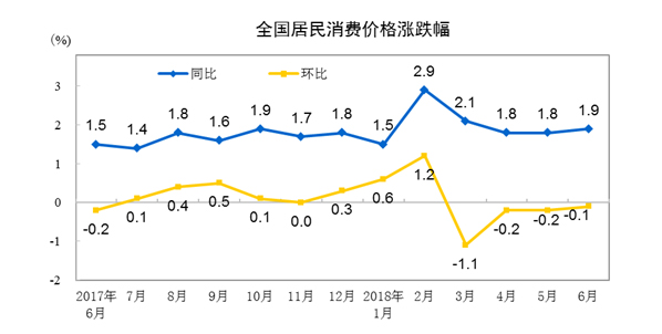 2018年6月份,全国居民消费价格同比上涨1.9%。其中,城市上涨1.8%,农村上涨1.9%;食品价格上涨0.3%,非食品价格上涨2.2%;消费品价格上涨1.5%,服务价格上涨2.4%。上半年,全国居民消费价格比去年同期上涨2.0%。