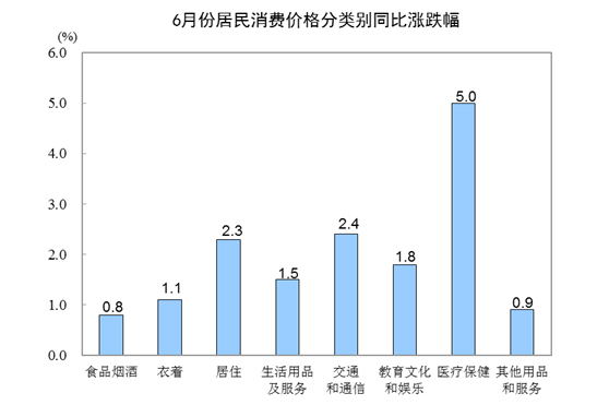 其他七大类价格同比均上涨。其中,医疗保健、交通和通信、居住价格分别上涨5.0%、2.4%和2.3%,教育文化和娱乐、生活用品及服务价格分别上涨1.8%和1.5%,衣着、其他用品和服务价格分别上涨1.1%和0.9%。