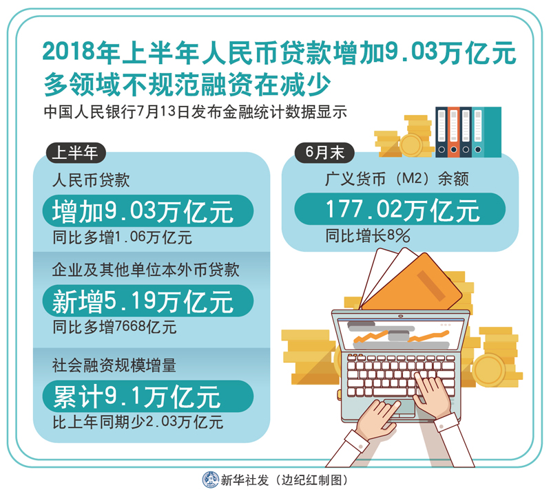 图表:2018年上半年人民币贷款增加9.03万亿元 多领域不规范融资在减少