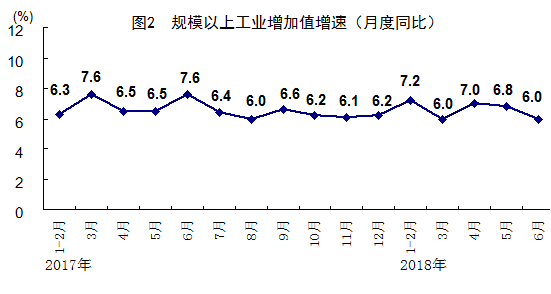 上半年,全国规模以上工业增加值同比实际增长6.7%,增速比一季度回落0.1个百分点。分经济类型看,国有控股企业增加值同比增长7.6%,集体企业下降1.9%,股份制企业增长6.7%,外商及港澳台商投资企业增长6.2%。分三大门类看,采矿业增加值同比增长1.6%,制造业增长6.9%,电力、热力、燃气及水生产和供应业增长10.5%。高技术产业和装备制造业增加值同比分别增长11.6%和9.2%,分别快于规模以上工业4.9和2.5个百分点。6月份,规模以上工业增加值同比增长6.0%。1-5月份,全国规模以上工业企业实现利润总额27298亿元,同比增长16.5%;规模以上工业企业主营业务收入利润率为6.36%,比上年同期提高0.35个百分点。