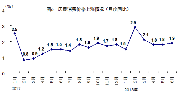 上半年,全国居民消费价格同比上涨2.0%,涨幅比一季度回落0.1个百分点。分类别看,食品烟酒价格同比上涨1.4%,衣着上涨1.1%,居住上涨2.3%,生活用品及服务上涨1.6%,交通和通信上涨1.2%,教育文化和娱乐上涨2.1%,医疗保健上涨5.5%,其他用品和服务上涨1.1%。6月份,全国居民消费价格同比上涨1.9%,涨幅比上月扩大0.1个百分点,环比下降0.1%。上半年,全国工业生产者出厂价格同比上涨3.9%,涨幅比一季度扩大0.2个百分点;全国工业生产者购进价格同比上涨4.4%。6月份,全国工业生产者出厂价格同比上涨4.7%,涨幅比上月扩大0.6个百分点,环比上涨0.3%;全国工业生产者购进价格同比上涨5.1%,环比上涨0.4%。