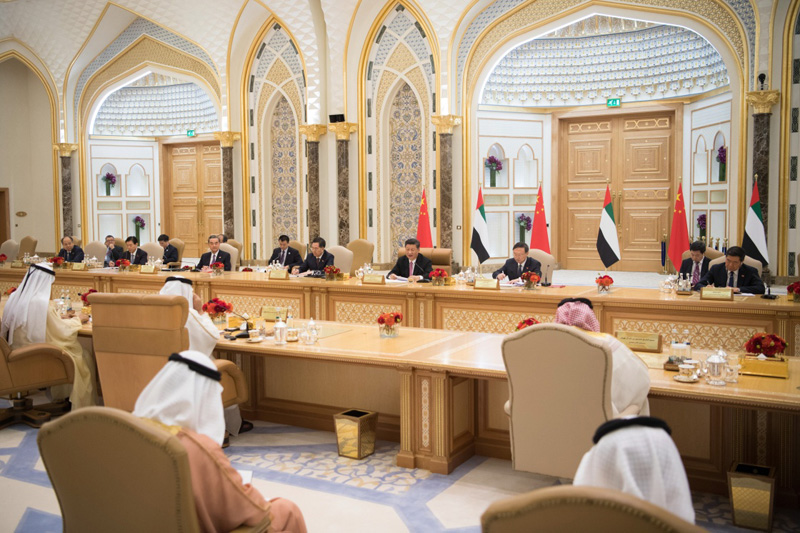 7月20日,国家主席习近平在阿布扎比同阿联酋副总统兼总理穆罕默德、阿布扎比王储穆罕默德举行会谈。新华社记者 李学仁 摄