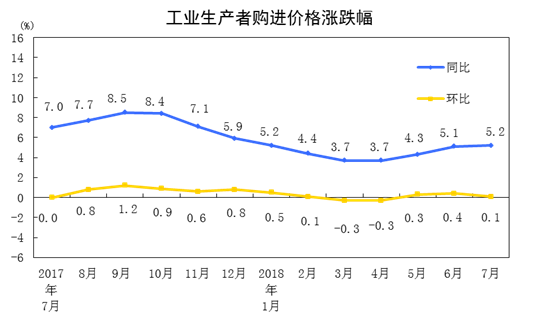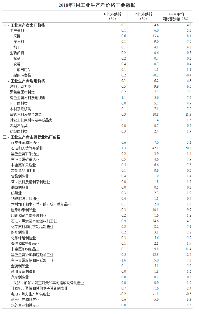 2018年7月份,全国工业生产者出厂价格同比上涨4.6%,环比上涨0.1%。工业生产者购进价格同比上涨5.2%,环比上涨0.1%。1-7月平均,工业生产者出厂价格比去年同期上涨4.0%,工业生产者购进价格上涨4.5%。