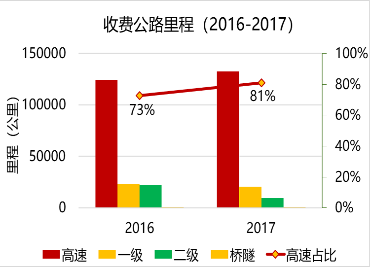 2017年末,全国收费公路里程比上年末净减少7356公里。其中,高速公路里程净增8130公里,增长6.5%,主要为新通车高速公路项目带来的里程增加。高速公路里程占比由2016年末的72.8%上升到81.0%。