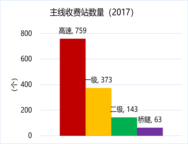 2017年末,全国收费公路共设主线收费站1338个,其中,高速公路759个,一级公路373个,二级公路143个,独立桥梁及隧道63个,占比分别为56.7%、27.9%、10.7%和4.7%。