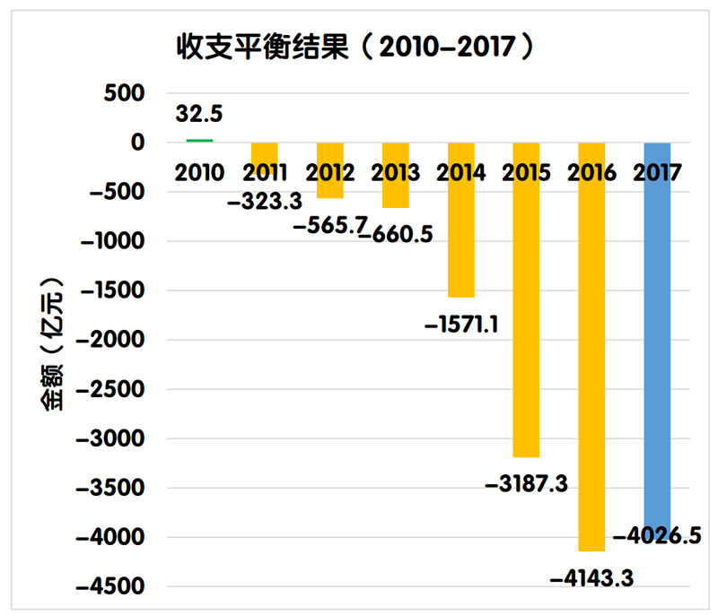 与2010年至2016年度(收支平衡结果依次为:170.2亿元、-114.4亿元、-59.4亿元、-101.1亿元、-277.4亿元、-1420.8亿元和-1992.7亿元)相比,收支缺口进一步扩大。