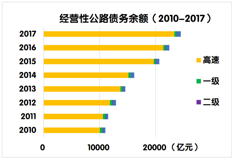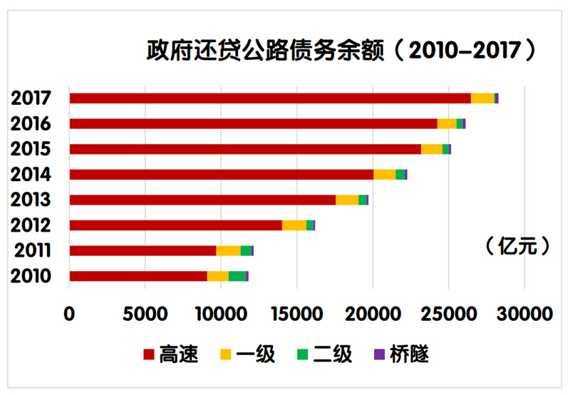 2017年末,全国收费公路债务余额52843.5亿元,比上年末净增4288.8亿元,增长8.8%。其中,高速公路49867.4亿元,一级公路1946.2亿元,二级公路135.9亿元,独立桥梁及隧道894.1亿元,占比分别为94.4%、3.7%、0.3%和1.7%。