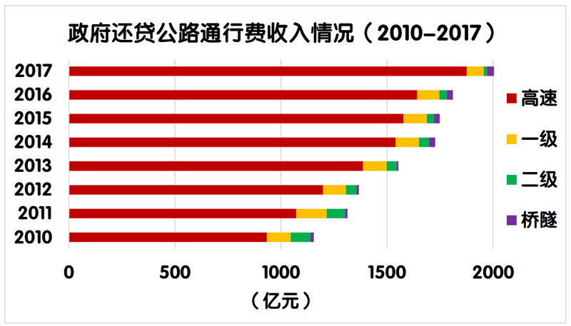 2017年末,政府还贷公路债务余额28279.8亿元,占全国收费公路债务余额的53.5%。其中,政府还贷高速公路债务余额26462.5亿元,一级公路1537.0亿元,二级公路63.6亿元,独立桥梁及隧道216.6亿元,占比分别为93.6%、5.4%、0.2%和0.8%。