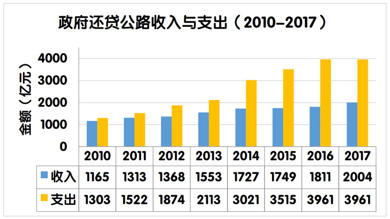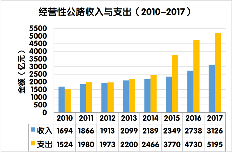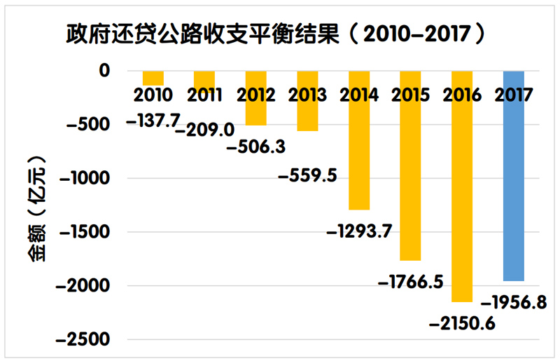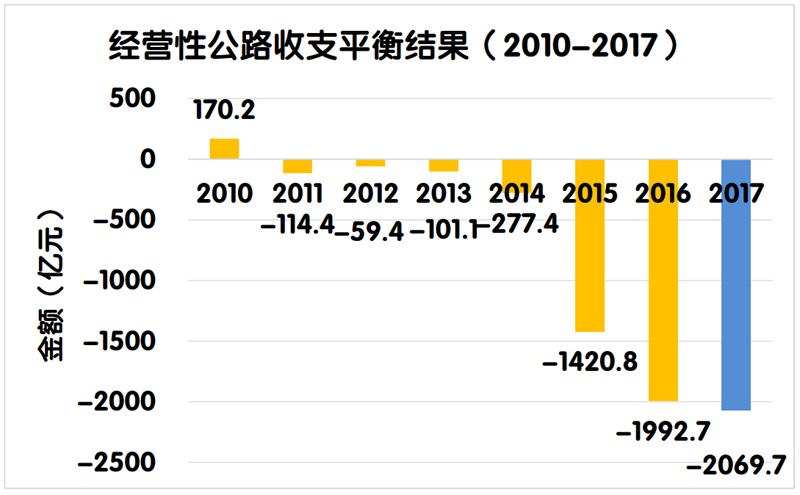 2017年度,全国收费公路收支平衡结果为-4026.5亿元,比上年减少116.8亿元,下降2.8%。但收支缺口仍然巨大。2010年至2017年度,收支平衡结果依次为:32.5亿元、-323.3亿元、-565.7亿元、-660.5亿元、-1571.1亿元、-3187.3亿元、-4143.3亿元和-4026.5亿元。