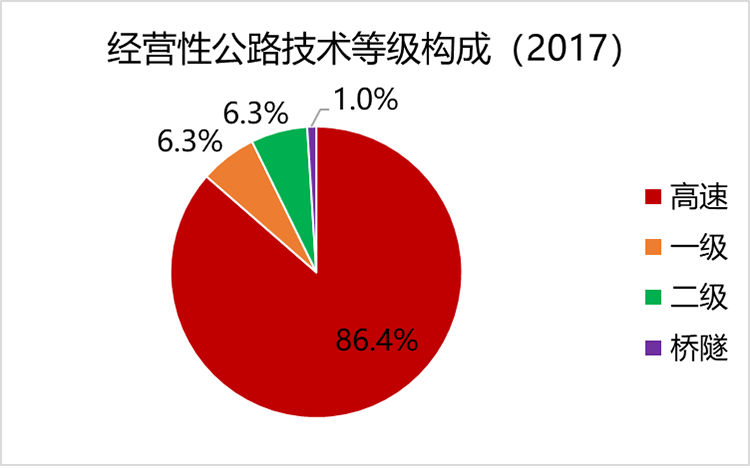 2017年末,全国收费公路里程16.37万公里,占公路总里程477.35万公里的3.4%。其中,高速公路13.26万公里,一级公路2.07万公里,二级公路0.95万公里,独立桥梁及隧道883公里,占比分别为81.0%、12.6%、5.8%和0.5%。