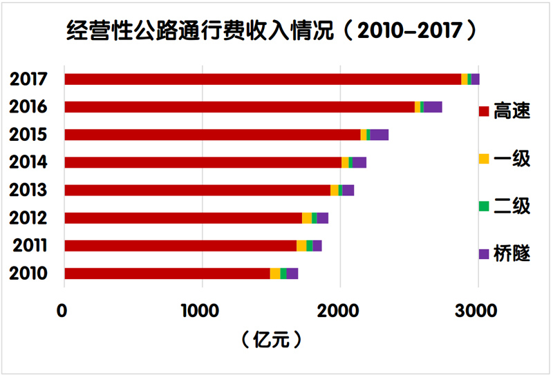2017年度,经营性公路通行费收入3125.8亿元,占收费公路通行费收入总额的60.9%。其中,经营性高速公路通行费收入2876.4亿元,一级公路45.0亿元,二级公路27.0亿元,独立桥梁及隧道177.3亿元,分别占经营性公路通行费收入的92.0%、1.4%、0.9%和5.7%。