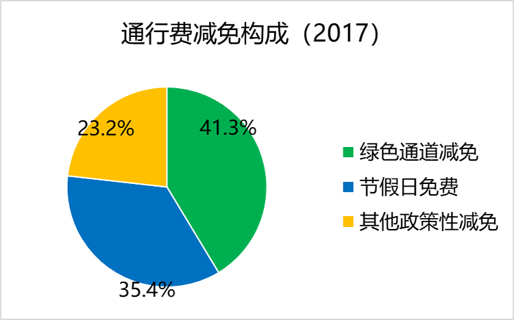 2017年度,全国收费公路共减免车辆通行费821.7亿元,占2017年度应收通行费总额的13.8%。其中,“绿色通道”(鲜活农产品运输车辆)减免339.8亿元,重大节假日小型客车免费通行减免291.2亿元,其他政策性减免190.7亿元,占比分别为41.3%、35.4%和23.2%。