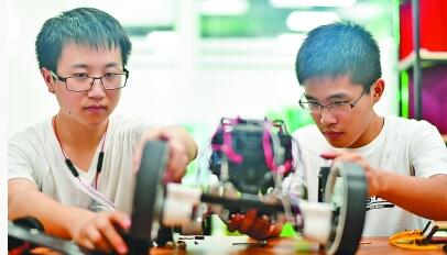 两名大学生在哈尔滨工业大学大学生创新创业园里调试机器人。新华社发