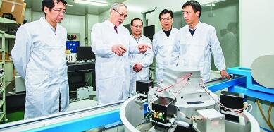 罗俊院士(左二)与杨山清教授(中)、胡忠坤教授(右二)、涂良成教授(右一)、周泽兵教授(左一)在华中科技大学引力实验中心交流引力波探测装置的运行情况。新华社发