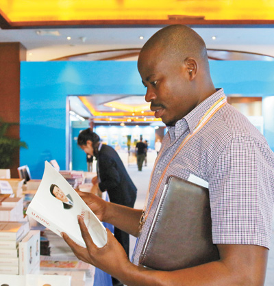 9月1日,在中非合作论坛北京峰会新闻中心,一名坦桑尼亚记者正在阅读《习近平谈治国理政》。记者 宦翔 摄