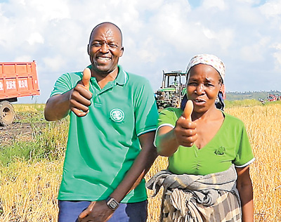 6月18日,在莫桑比克的中非农业合作项目水稻收割现场,当地农民竖起大拇指喜迎丰收。资料图片