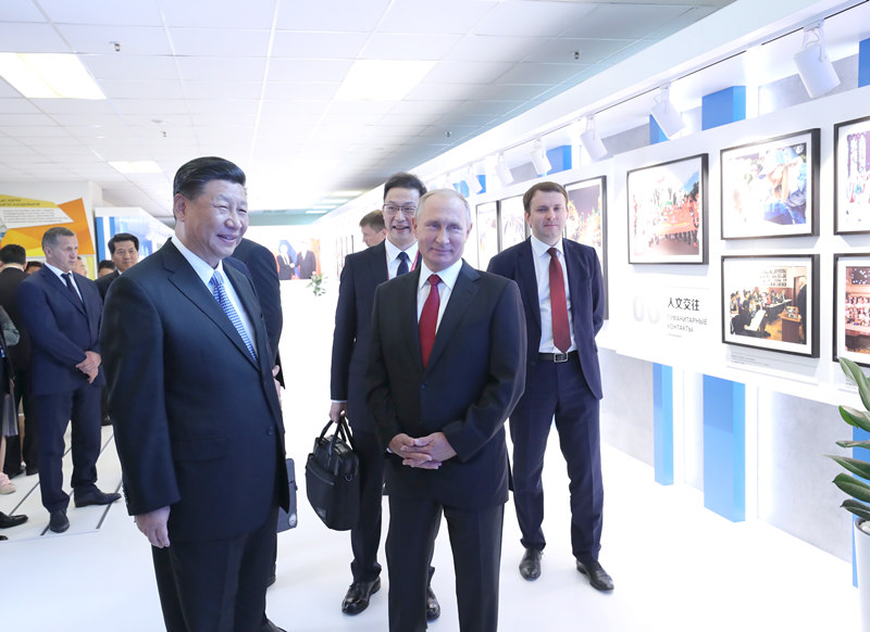 习近平离开俄罗斯符拉迪沃斯托克前,和俄罗斯总统普京共同参观了中俄经贸合作图片展。启程回国时,俄罗斯高级官员到机场送行。