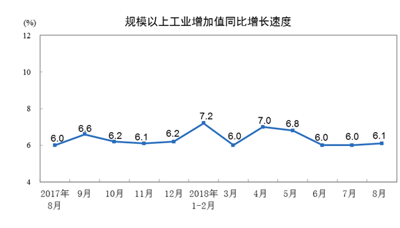 2018年8月份,规模以上工业增加值同比实际增长6.1%(以下增加值增速均为扣除价格因素的实际增长率),比7月份加快0.1个百分点。从环比看,8月份,规模以上工业增加值比上月增长0.52%。1-8月份,规模以上工业增加值同比增长6.5%,增速较1-7月份回落0.1个百分点。