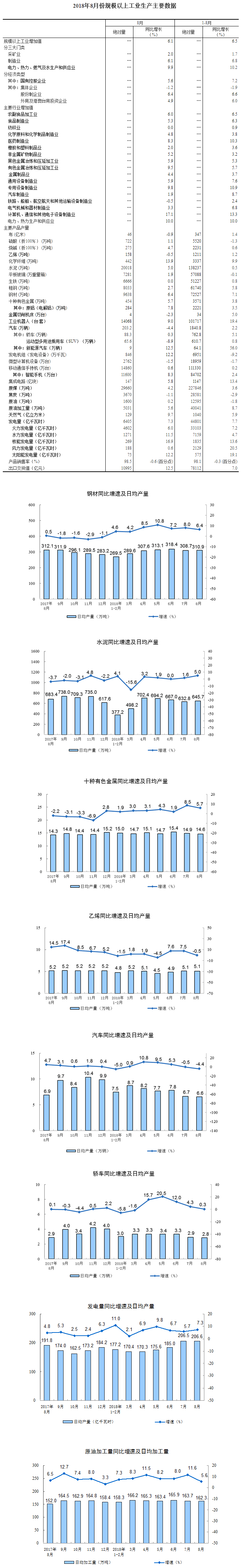 分产品看,8月份,596种产品中有336种产品同比增长。其中,钢材9638万吨,同比增长6.4%;水泥20018万吨,增长5.0%;十种有色金属454万吨,增长5.7%;乙烯158万吨,下降0.5%;汽车203.2万辆,下降4.4%;轿车88.3万辆,增长0.3%;发电量6405亿千瓦时,增长7.3%;原油加工量5031万吨,增长5.6%。