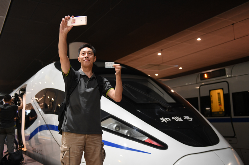 9月23日,搭乘G5711次高铁列车前往香港西九龙站的乘客在深圳北站拍照留念。