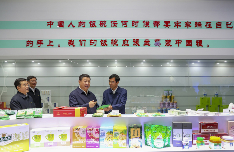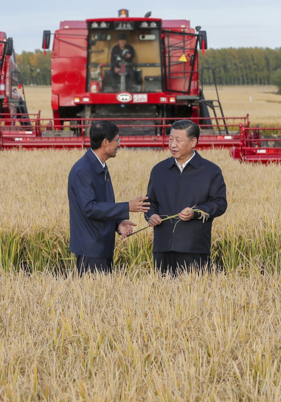 25日下午,首个“中国农民丰收节”刚过,习近平就深入三江平原腹地黑龙江农垦建三江管理局,考察粮食生产和收获情况。他边听介绍,边向农场负责人询问今年收成如何、有没有病虫害、能否做到连年丰收,并强调中国人的饭碗任何时候都要牢牢端在自己的手上。在北大荒精准农业农机中心一楼大厅,当地出产的米油豆奶等各类农产品摆满展台。习近平走近前去,双手捧起一碗大米,意味深长地说:“中国粮食,中国饭碗。”(文字:张晓松 摄影:谢环驰)