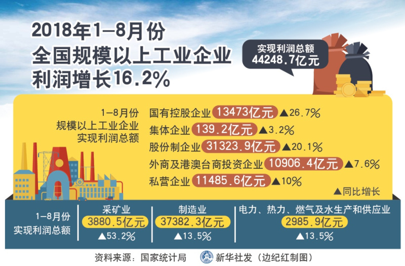 图表:2018年1-8月份全国规模以上工业企业利润增长16.2%