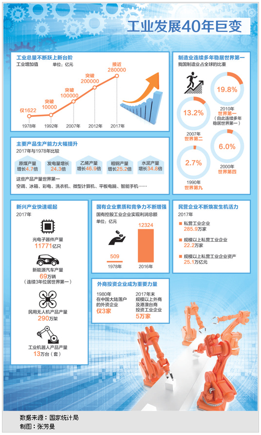如果按可比价计算,改革开放40年来,中国工业增加值年均增长10.8%,2017年比1978年增长了53倍,很多产业从无到有,200多种工业产品产量位居世界第一。