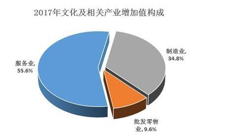 按行业分,2017年文化制造业增加值为12094亿元,比上年增长1.7%,占文化及相关产业增加值的比重为34.8%;文化批发零售业增加值为3328亿元,增长15.9%,占比为9.6%;文化服务业增加值为19300亿元,增长20.4%,占比为55.6%。