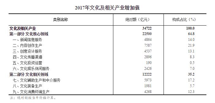 经核算,2017年全国文化及相关产业增加值为34722亿元,占GDP的比重为4.2%,比上年提高0.06个百分点;按现价计算(下同),比上年增长12.8%,比同期GDP名义增速高1.6个百分点。2017年文化及相关产业增加值保持平稳快速增长,占GDP比重稳步上升,在加快新旧动能转换、推动经济高质量发展中发挥了积极作用。