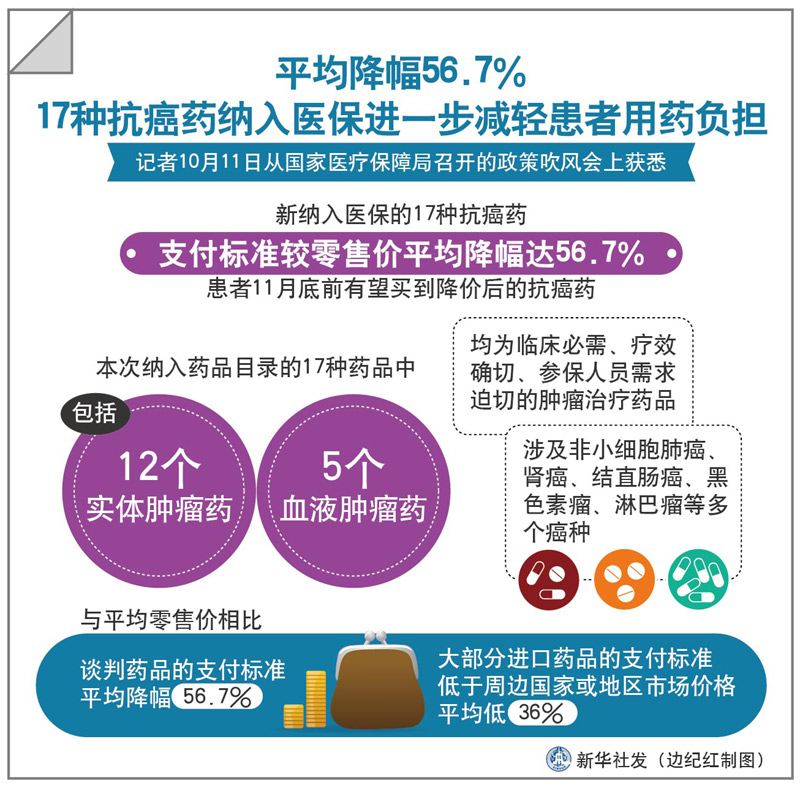 图表:平均降幅56.7% 17种抗癌药纳入医保进一步减轻患者用药负担