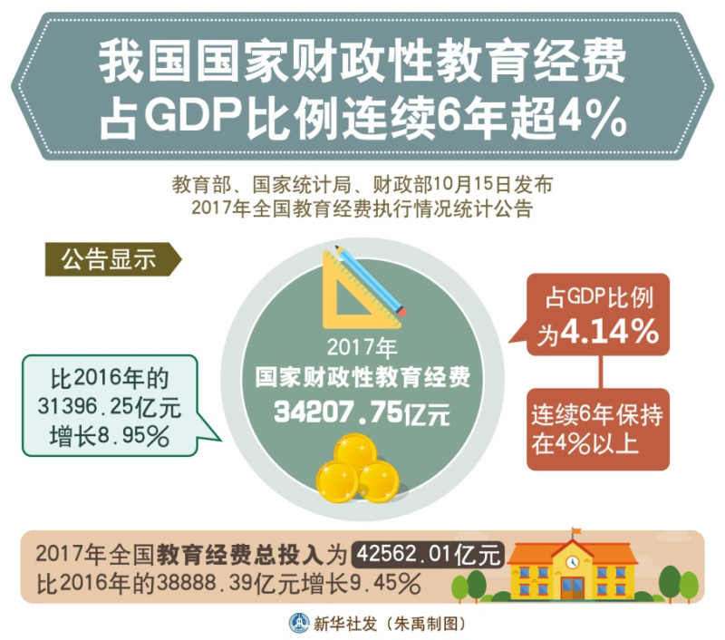 图表:我国国家财政性教育经费占GDP比例连续6年超4%