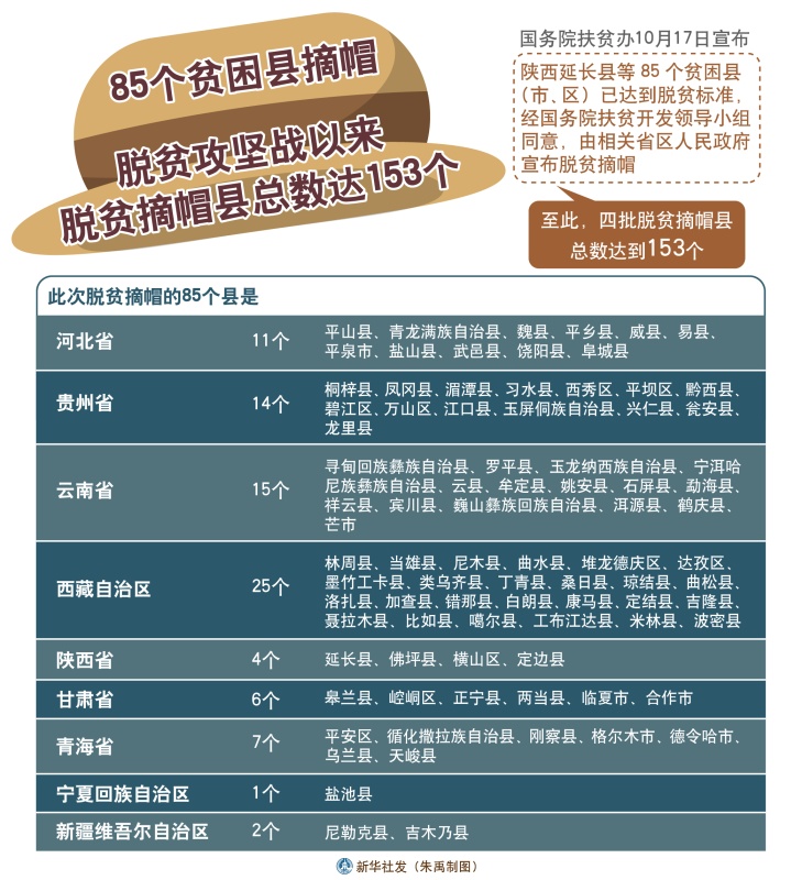 图表:85个贫困县摘帽 脱贫攻坚战以来脱贫摘帽县总数达153个