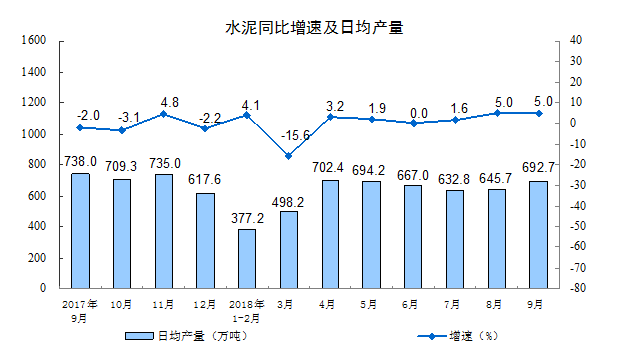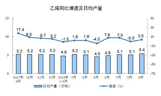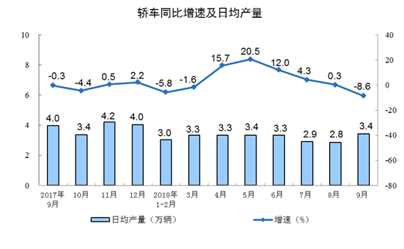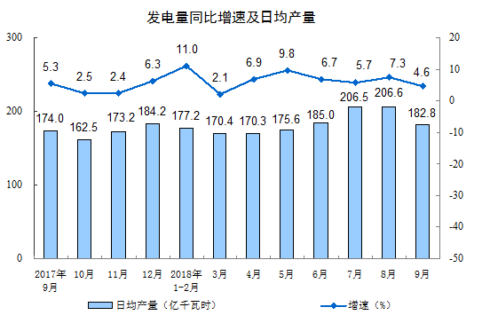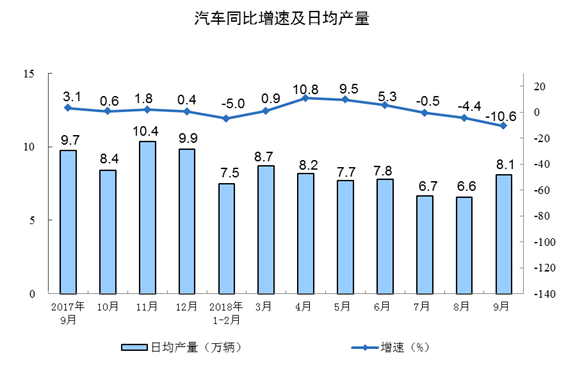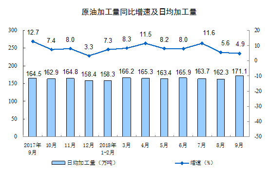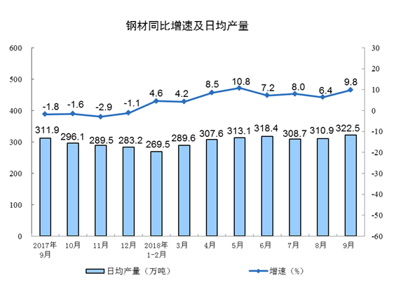 分产品看,9月份,596种产品中有324种产品同比增长。其中,钢材9675万吨,同比增长9.8%;水泥20781万吨,增长5.0%;十种有色金属456万吨,增长5.8%;乙烯161万吨,增长3.5%;汽车242.6万辆,下降10.6%;轿车102.8万辆,下降8.6%;发电量5483亿千瓦时,增长4.6%;原油加工量5134万吨,增长4.9%。