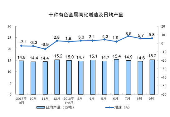 分行业看,9月份,41个大类行业中有38个行业增加值保持同比增长。其中,农副食品加工业增长5.5%,纺织业增长0.8%,化学原料和化学制品制造业增长5.0%,非金属矿物制品业增长5.2%,黑色金属冶炼和压延加工业增长10.1%,有色金属冶炼和压延加工业增长9.8%,通用设备制造业增长6.1%,专用设备制造业增长9.7%,汽车制造业增长0.7%,铁路、船舶、航空航天和其他运输设备制造业增长2.4%,电气机械和器材制造业增长5.2%,计算机、通信和其他电子设备制造业增长12.6%,电力、热力生产和供应业增长11.0%。