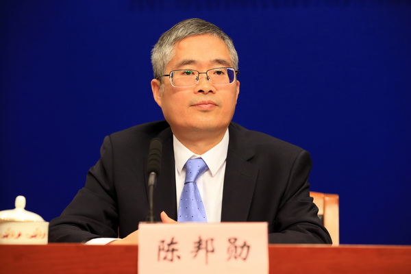 农业农村部于2018年11月8日(周四)上午10时,在农业农村部新闻办公室举行新闻发布会,介绍2018年全国新农民新技术创业创新博览会有关情况,并回答记者提问,图为农业农村部办公厅副主任巡视员陈邦勋主持新闻发布会。农业农村部网站 梁宝忠 摄