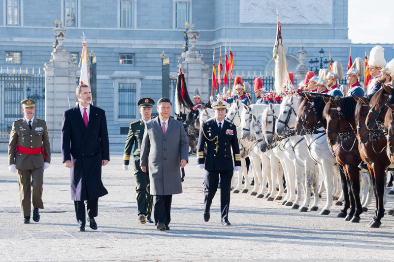 习近平和夫人彭丽媛乘皇家礼车在身着礼服、骑着高头大马的西班牙皇家卫队骑兵护卫下,前往武器广场。抵达时,鼓乐齐鸣,费利佩六世国王和莱蒂西娅王后上前迎接,互致问候。费利佩六世向习近平介绍王室高级官员。随后,两国元首夫妇一同登上检阅台。在21响礼炮声中,军乐团奏中国、西班牙两国国歌。仪仗队长趋前请习近平检阅。习近平在费利佩六世国王陪同下依次检阅步兵方队、骑兵方队和摩托车队。习近平同西方陪同人员握手,费利佩六世国王同中方陪同人员握手。两国元首夫妇返回检阅台,观看分列式。在摩托车队引领下,整齐的军乐队、雄赳赳的步兵方队、威武的骑兵方队依次通过检阅台。