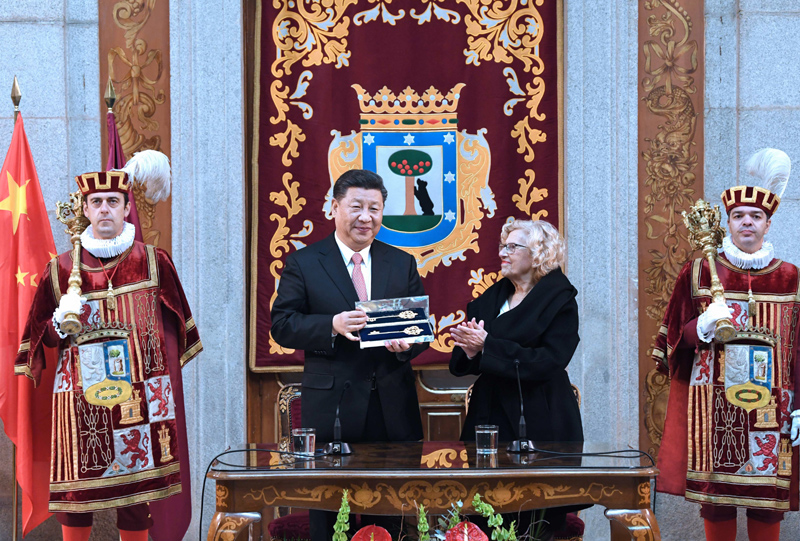 当地时间11月28日,国家主席习近平在马德里市政厅接受马德里城市金钥匙。新华社记者 饶爱民 摄