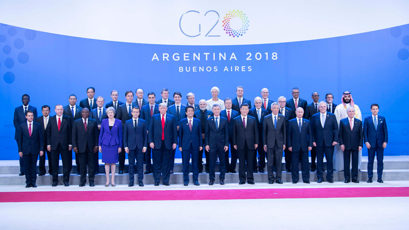 当地时间11月30日,二十国集团领导人第十三次峰会在阿根廷布宜诺斯艾利斯举行。国家主席习近平出席第一阶段会议并发表题为《登高望远,牢牢把握世界经济正确方向》的重要讲话。这是习近平同其他与会领导人合影。新华社记者 李涛 摄