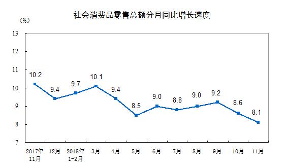 2018年1-11月份,社会消费品零售总额345093亿元,同比增长9.1%。其中,限额以上单位消费品零售额130830亿元,增长6.1%。